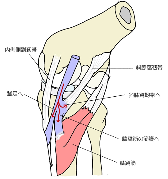 1. 脛骨への索 : 腹側で迂回し、内側側副靱帯の下の脛骨内側顆に付く。