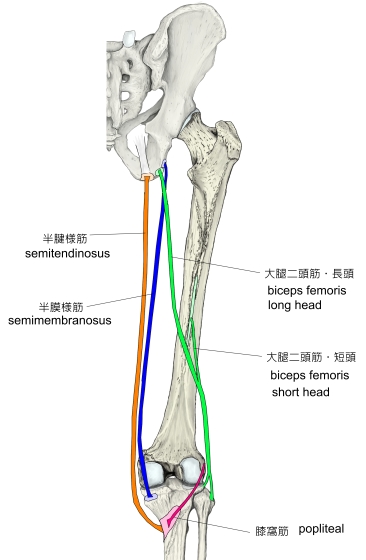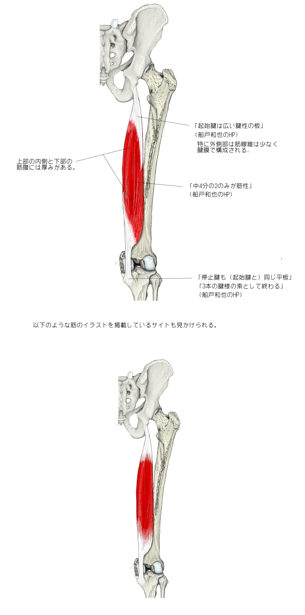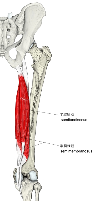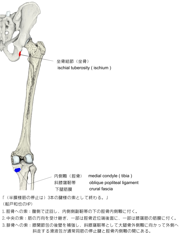 「半膜様筋は大腿二頭筋長頭と大腿方形筋の起始の間の坐骨結節から起こる。脛骨内側顆、膝関節包後壁および膝窩筋の筋膜に停止する。半膜様筋は中4分の2のみが筋性である。起始腱は広い腱性の板をなし、停止腱も同じ平板である。3本の腱様の索として終わる。脛骨への索は腹側で迂回し、内側側副靱帯の下の脛骨内側顆に付く。中央の索は筋の方向を受け継ぎ、一部は脛骨近位端後面に、一部は膝窩筋の筋膜に付く。腓骨への索は膝関節包の後壁を補強し、斜膝窩靱帯として大腿骨外側顆に向かって外側へ射創する滑液包が通常同筋の停止腱と脛骨内側顆の間にある。」