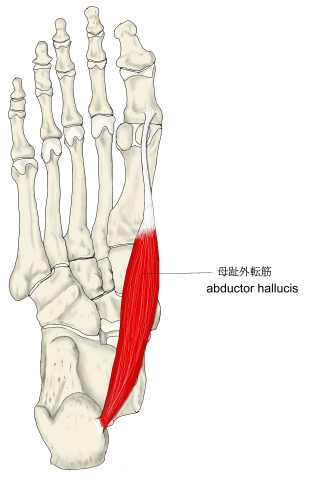 「母趾外転筋は踵骨隆起の内側突起、屈筋支帯および足底腱膜から起始する。腱となり内側種子骨を介して母趾の基節骨底内側面および短母趾屈筋の内側腱に停止する。内側足底神経の支配を受ける。この筋の収縮は母趾の屈筋と外転とをもたらす(体重を支えていない下肢の場合)。また、体重を支えている下肢においては、この筋の収縮が内側縦足弓の維持に役立つ。」