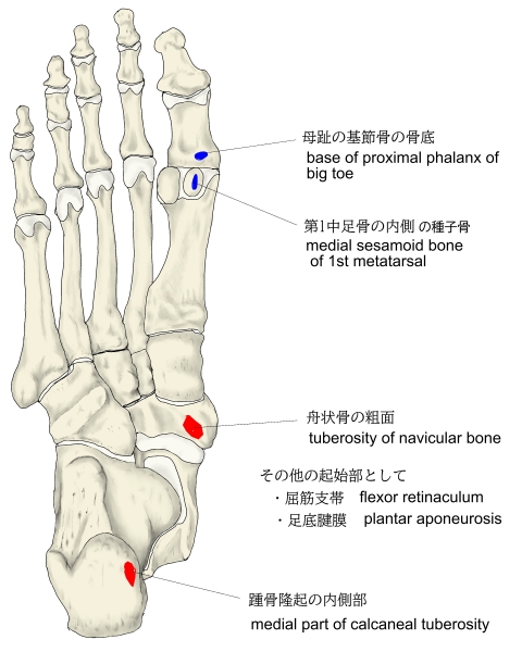 【 起 始 】: 踵骨隆起(踵骨)の内側部、屈筋支帯、足底腱膜、舟状骨の粗面
