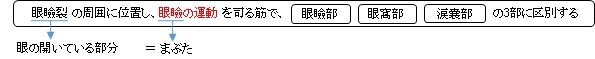 「 眼瞼を閉じ、( 眼瞼部、眼窩部 )、涙嚢を開ける。( 涙嚢部 )」 ( 日本人体解剖学 )
