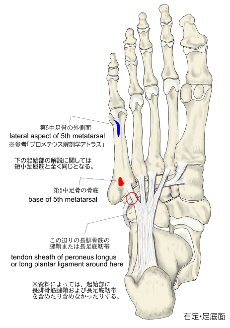 ※「短小趾屈筋と小趾対立筋は第5中足骨底、長足底靱帯およびから共通腱をもって起こる。」(船戸和也のHP)