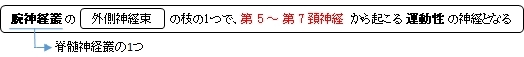 「 運動性:第5~第7頚神経から起こり、鎖骨の下で鎖骨下動脈・静脈の前側を下行して、大胸筋(小胸筋)に至る。内側胸筋神経と外側胸筋神経を合わせて前胸神経ということがある。 」