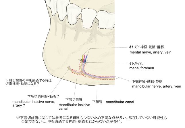(下顎)切歯神経 ( (かがく)せっししんけい、 英:(mandibular) incisive nerve ) 一般的な呼称がどうかは不明。しかも、参考になる資料がかなり限られるので以下の解説は正確性に欠ける可能性がかなりある。 ・下歯槽神経がオトガイ孔の下部にて分岐し、下顎切歯管を走行する神経を切歯神経と呼ぶようである。 ・下顎切歯管を出て切歯の方にに向かう神経を下顎切歯神経と呼ぶようである。