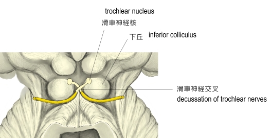 「日本人体解剖学 (上巻) 「中前頭回下部の錐体細胞からの線維(一次ニューロン)は、滑車神経核に入り、滑車神経核の細胞(二次ニューロン)と連絡する。滑車神経核は運動性で、中脳水道の底で動眼神経核のすぐ後方に位置する。滑車神経核からの線維は中心灰白層の外側をめぐって背方に走り、上髄帆内で滑車神経交叉を行った後、下丘のすぐ後ろで脳を出る。 」