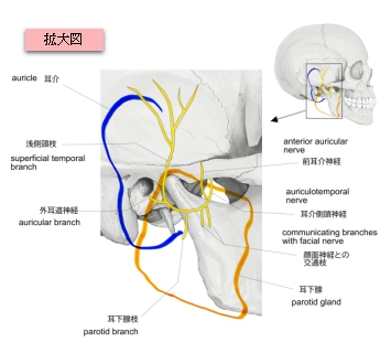 耳介側頭神経の分布は 基本的には枝による分布 で理解してよい。