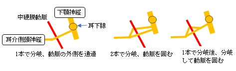 また、1本で分岐しても中硬膜動脈の前で二分岐し、動脈を挟んで通過したのちに再び1本になるケースもある。)