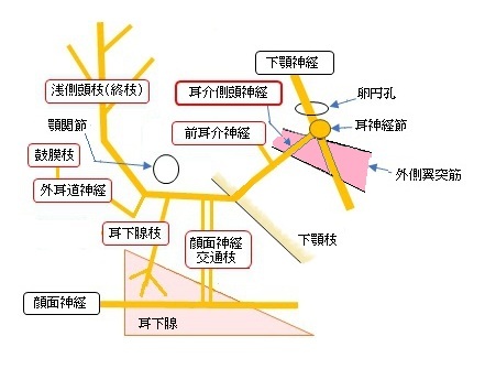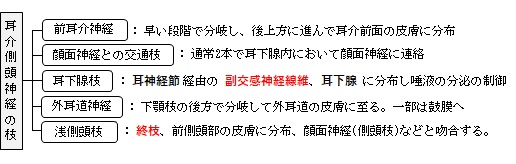 4. 耳介の前方を上方に向かい浅側頭枝(終枝)となって側頭前部の皮膚に分布する。