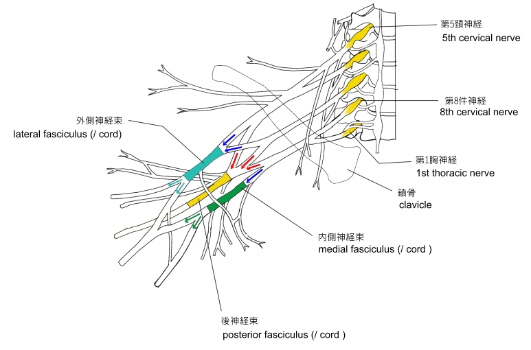「ついで、外側神経束、内側神経束はおのおの分かれて2枝となり、このようにしてできた4枚のうち、中央の2枝は合っして正中神経を作り、外側神経束の他の1枝すなわち外側枝は筋皮神経、内側神経束の他の1枝すなわち内側枝はさらに3枝に分かれて尺骨神経、内側上腕皮神経、内側前腕皮神経となる。 」