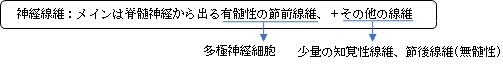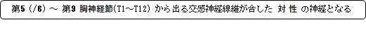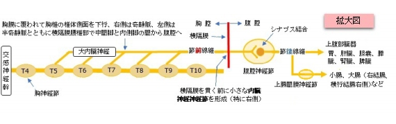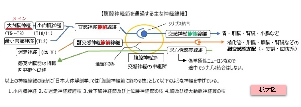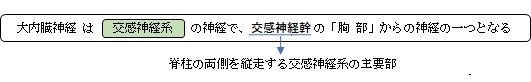 大内臓神経(交感神経)( だいないぞうしんけい,英:greater splanchnic nerve ) ・概 要 ・走 行 ・参考となるサイト(日本人体解剖学、ウィキペディア、イラスト掲載サイト) 【概 要】 ・知覚性線維:大内臓神経が神経支配する臓器から来る神経線維 ・節後線維:腹腔神経叢や近くの神経節から来る交感神経系の神経線維 【走 行】 1. 各側の第5(又は第6)~第9胸神経節から出る交感神経線維が合する。 (この場合の交感神経線維は有髄性の節前線維(多極神経細胞) 2. 合した神経線維は胸膜に覆われながら椎体の側面を下行する。 3. 右側は奇静脈、左側は半奇静脈とともに横隔膜腰椎部で中間脚と内側脚の間を通って腹腔内に入る。 (横隔膜を貫通する前に小さな内臓神経神経節を形成する。特に右側) 4. 腹腔動脈の近くにある腹腔神経節に入ってシナプス結合をする。 以下は腹腔神経節を通る神経線維を表した模式図となる。 以下は胸部の交感神経幹からの枝を簡単に表した図となる。 【参考となるサイト】 「 日本人体解剖学 (上巻) 」では以下のように解説している。 「第5(あるいは第6)~第9胸神経節から出る枝が合したもので、各側の神経は胸膜におおわれて胸椎の椎体側面を下行し、右側は奇静脈、左側は半奇静脈とともに横隔膜腰椎部で中間脚と内側脚との間を通って腹腔内に入り、腹腔神経叢に至る。大内臓神経が、横隔膜を貫く前に小さな神経節、すなわち内臓神経神経節がみられる。(とくに右側)」 また、以下は「ウィキペディア」の解説文からの抜粋文となる。 「主として胸髄のT6~T9(またはT5~T10)からおこる自律神経(交感神経)の節前繊維である。すなわち、脊髄から出て交感神経幹を通るがそこではニューロンを乗り換えず、そのまま腹腔に達しているものである。なお、大内臓神経・小内臓神経・最小内臓神経などを合わせて胸内臓神経(thoracic splanchnic nerves)ということがある。」 「一部は腎神経叢に入りここにある椎前神経節でニューロンを乗り換え、腹部の臓器に分布する。」 交感神経(胸部)・模型図 【参考になるサイト】 ・イラストや写真を掲載しているサイト-Ⅰ ・イラストや写真を掲載しているサイト-Ⅱ ・イラストや写真を掲載しているサイト-Ⅲ ・イラストや写真を掲載しているサイト-Ⅳ ・イラストや写真を掲載しているサイト-Ⅴ