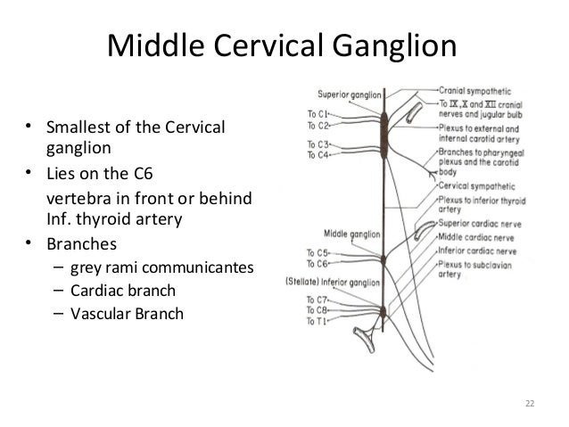 下頚神経節( かけいしんけいせつ、英:inferior cervical ganglion ) 下頚神経節とは 形 状 : 不正四角形で中等大の神経節 位 置 : 第7頚椎の横突起の前に位置する。 交 通 : 交通枝により第7/8頚神経と交通している。 その他 :「第2胸神経節と融合して、扁平星状の頚胸神経節(星状神経節 stellate ganglion)をつくることがある。」( 日本人体解剖学 (上巻) ) 【 枝 】 下頚神経節からは以下の枝が出ている。 交感神経幹・頭頚部 【参考になるサイト】 ・イラストや写真を掲載しているサイト-Ⅰ ・イラストや写真を掲載しているサイト-Ⅱ ・イラストや写真を掲載しているサイト-Ⅲ ・イラストや写真を掲載しているサイト-Ⅳ ・イラストや写真を掲載しているサイト-Ⅴ