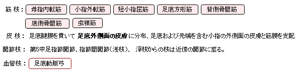 固有底側指神経 : 皮 枝 ) 足底および先端を含む小指の外側面の皮膚と筋膜を支配