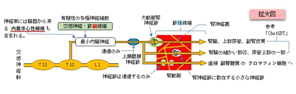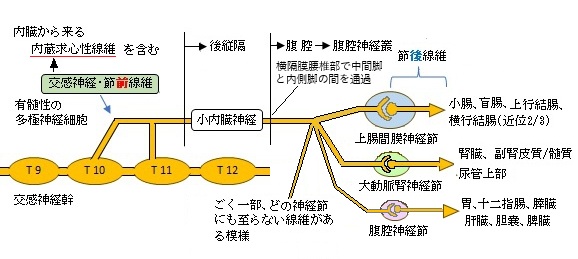 - 腹腔神経叢(celiac plexus)や 上腸間膜神経節(superior mesenteric ganglion)、腎神経叢(renal plexus) に到達