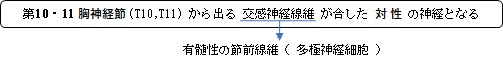 小内臓神経(交感神経)( しょうないぞうしんけい、英:lesser splanchnic nerve ) ・概 要 ・走 行 ・参考となるサイト(日本人体解剖学、イラスト掲載サイト) 【概 要】 【走 行】 1. 第10・11 胸神経節から出る交感神経線維が合する。 ( この場合の交感神経線維は有髄性の節前線維(多極神経細胞) (「ChatGPT」によれば合した神経線維には内臓からくる感覚線維も見られるようだ。) 2. 合した神経線維は後縦隔を下行し、横隔膜腰椎部で中間脚と内側脚の間を通って腹腔内に入る。 (背側では椎体に沿って走行し、胸大動脈や奇静脈系の近くを通る。) (「通過点は、大内臓神経と類似するが、小内臓神経は少し下の高さを通る。(ChatGPT)」 3. 腹腔内に入った後は腹膜神経叢に合流し、おもに 上腸間膜神経節、さらに 大動脈腎神経節 に至ってシナプス結合する。 4. 神経節でシナプス結合し、節後線維となって腸や腎臓などの臓器へ分布する。 ・「 腎枝は、また最下内臓神経として交感神経幹から直接起始することがある。」(日本人体解剖学 (上巻)) 以下は胸部の交感神経幹からの枝を簡単に表した図となる。 【参考となるサイト】 「 日本人体解剖学 (上巻) 」では以下のように解説している。 「第10~第12胸神経節から起こり、胸椎の側面を走って前記の大内臓神経とともに、あるいはその少し外側で横隔膜を貫いて腹腔内に入り、一部は腹腔神経叢に達し、一部は腎枝として腎動脈を取り巻く腎神経叢に入る。腎枝は、また最下内臓神経として交感神経幹から直接起始することがある。 」 交感神経(胸部)・模型図 【参考になるサイト】 ・イラストや写真を掲載しているサイト-Ⅰ ・イラストや写真を掲載しているサイト-Ⅱ ・イラストや写真を掲載しているサイト-Ⅲ ・イラストや写真を掲載しているサイト-Ⅳ ・イラストや写真を掲載しているサイト-Ⅴ