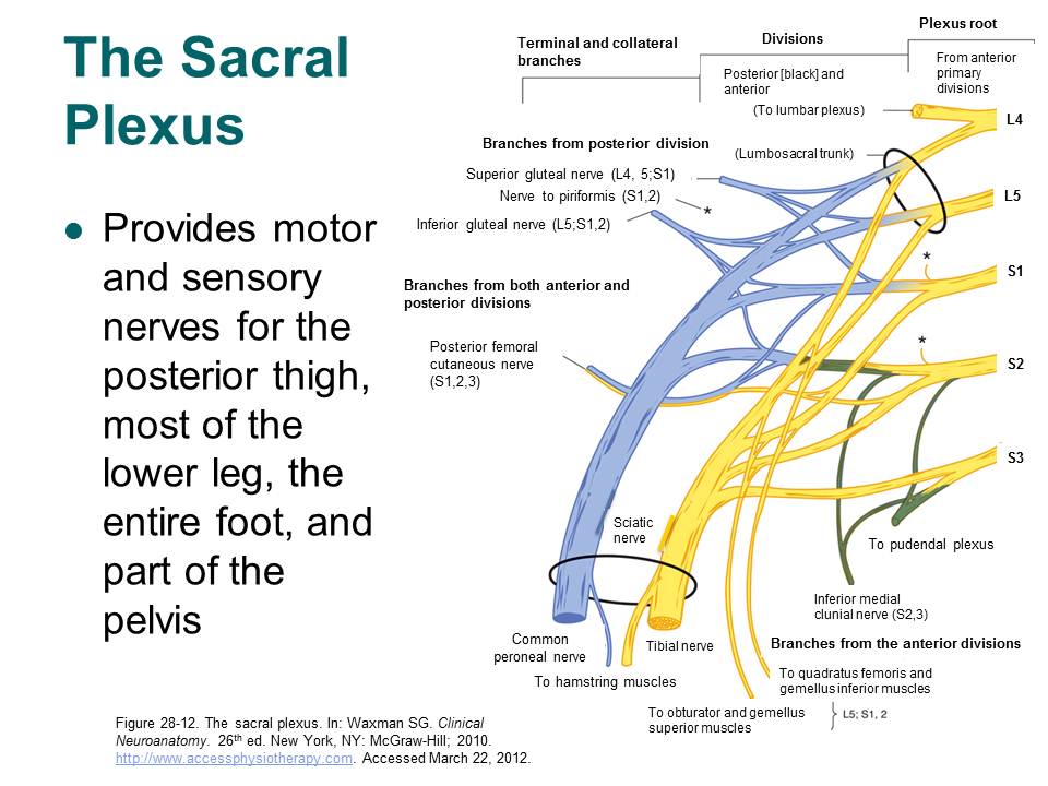 「 In human anatomy, the sacral plexus is a nerve plexus which provides motor and sensory nerves for the posterior thigh, most of the lower leg and foot, and part of the pelvis. It is part of the lumbosacral plexus and emerges from the lumbar vertebrae and sacral vertebrae (L4-S4).[1] A sacral plexopathy is a disorder affecting the nerves of the sacral plexus, usually caused by trauma , nerve compression, vascular disease, or infection. Symptoms may include pain, loss of motor control, and sensory deficits.
