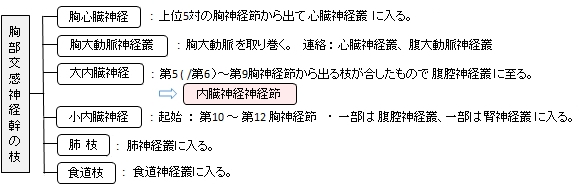 内臓神経神経節 ( ないぞうしんけいしんけいせつ、英 : splanchnic ganglion ) 内臓神経神経節とは 以下は胸部の交感神経幹からの枝を簡単に表した図となる。 以下は「 日本人体解剖学 (上巻) 」の「 大内臓神経 」の解説文となる。 「第5(あるいは第6)~第9胸神経節から出る枝が合したもので、各側の神経は胸膜におおわれて胸椎の椎体側面を下行し、右側は奇静脈、左側は半奇静脈とともに横隔膜腰椎部で中間脚と内側脚との間を通って腹腔内に入り、腹腔神経叢に至る。大内臓神経が、横隔膜を貫く前に小さな神経節、すなわち内臓神経神経節がみられる。(とくに右側) 」
