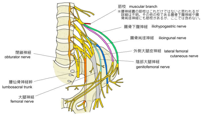 ・lumbar nerve:腰神経 ・iliohypogastric nerve:腸骨下腹神経 ・psoas major:大腰筋 ・quadratus lumborum:腰方形筋 ・iliacus:腸骨筋 ・iliac crest:腸骨稜 ・transversus muscle:腹横筋 ・internal oblique muscle:内腹斜筋 ・spermatic cord:精巣 ・round ligament of uterus:子宮円索 ・superficial inguinal ring浅鼡径輪: ・anterior scrotal nerve:前陰嚢神経 ・penis:陰茎 ・scrotum:陰嚢 ・anterior labial nerve:前陰唇神経 ・mons pubis:恥丘 ・labia majora:大陰唇 ・deep inguinal ring:深鼡径輪 ・infuinal canal:鼡径管 ・be in inverse proportion to ~:~に反比例している ・occasionally:時折
