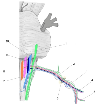 迷走神経・起始核( 前面 ) 1 三叉神経脊髄路核 2 上神経節 詳細 3 下神経節 詳細 4 咽頭枝 詳細 5 上喉頭神経 詳細 6 頚静脈孔 詳細 7 迷走神経背側核 8 疑核 9 孤束核(味覚線維の領域) 10 孤束核 ⇒ 名称付きイラスト 【関連イラスト】 起始核(オリーブの高さの横断面)