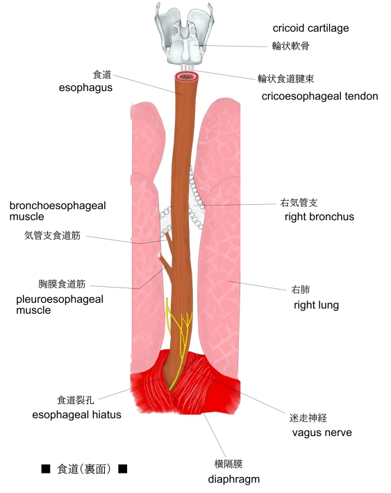 ■ 胸 部:thoracic part ■ ・胸腔に入ると次第に気管の左側を走り、気管分岐部の少し下では左気管支のほぼ後ろを通る。 ・胸椎および胸大動脈の前を(はじめ胸大動脈の右側に位置するが次第にその前に出る)下行して横隔膜の食道裂孔を通って腹腔へ。(横隔膜を貫くときには大動脈の前左方を走るようになる。) ・上部では、食道の右側を奇静脈が、後側を胸管が上方に向かって走る。