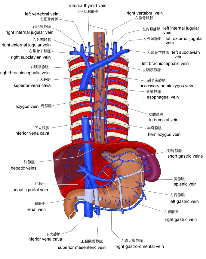 【静 脈】 食道静脈、下甲状腺静脈、奇静脈、半奇静脈、(奇静脈を介して上大静脈と連絡する)、胃冠状静脈(この静脈により門脈と交通する)