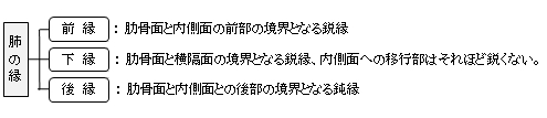 肺は以下の3つの縁を区別する。3つとも面同士の境界縁となる。