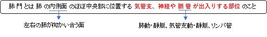 ・「肺門では気管支が最も後方に、その前方に肺動脈、さらに前方に肺静脈が位置する。」(日本人体解剖学)