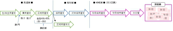 葉気管支→区域気管支→細気管支→終末細気管支→呼吸細気管支→肺胞管→ 肺胞嚢→肺胞 」