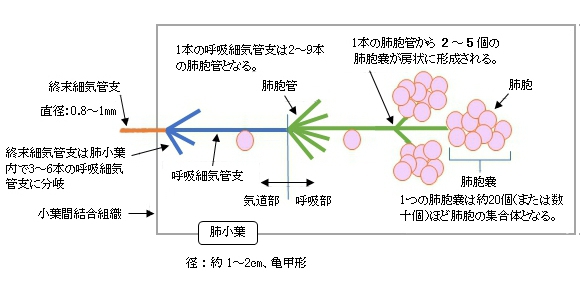 主に気道と血管からなり、ガス交換のため両者は肺胞で接している。肺胞は約3億個で、