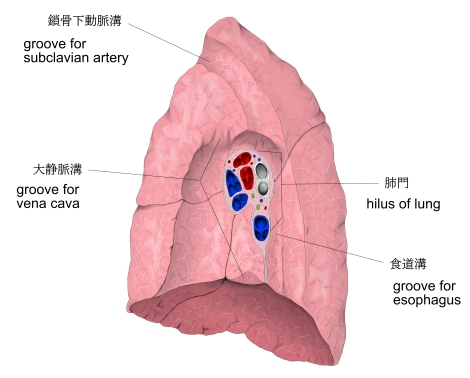 がみられる。さらに、左肺は左腕頭静脈による左腕頭静脈溝、右肺は上大静脈による